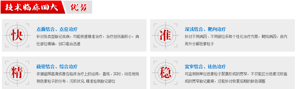 临床研究证实:胎记三大根本发病原因在于:①色素细胞生长因子(PGF)繁殖能力过快、色素裂变能力过高;②色素病变细胞、变异细胞、样变细胞聚集下潜皮层组织;③色素沉着(皮层过度沉积、色素过度沉着)。超频成像检测利用断层检测技术+可视化检测技术,靶向定位病灶部位,根据胎记表皮和内在分布密度和面积,进行精确定位分级分型,从而达到胎记的精细化,标准化诊疗。