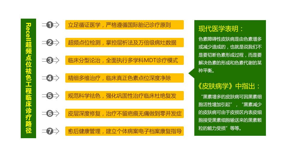 我院的Recell超频点位祛色工程疗法,立足于从细胞学、机理微循环、生物物理学、分子免疫学等多学科出发,立体综合治疗黑色胎记疾病。根据各项疾病的发病因素,快速依据检查结果,以点带面,点位结合,针对各类型黑色胎记疾病,均能快速精准治疗。实现黑色规范化、标准化、科学化治疗。