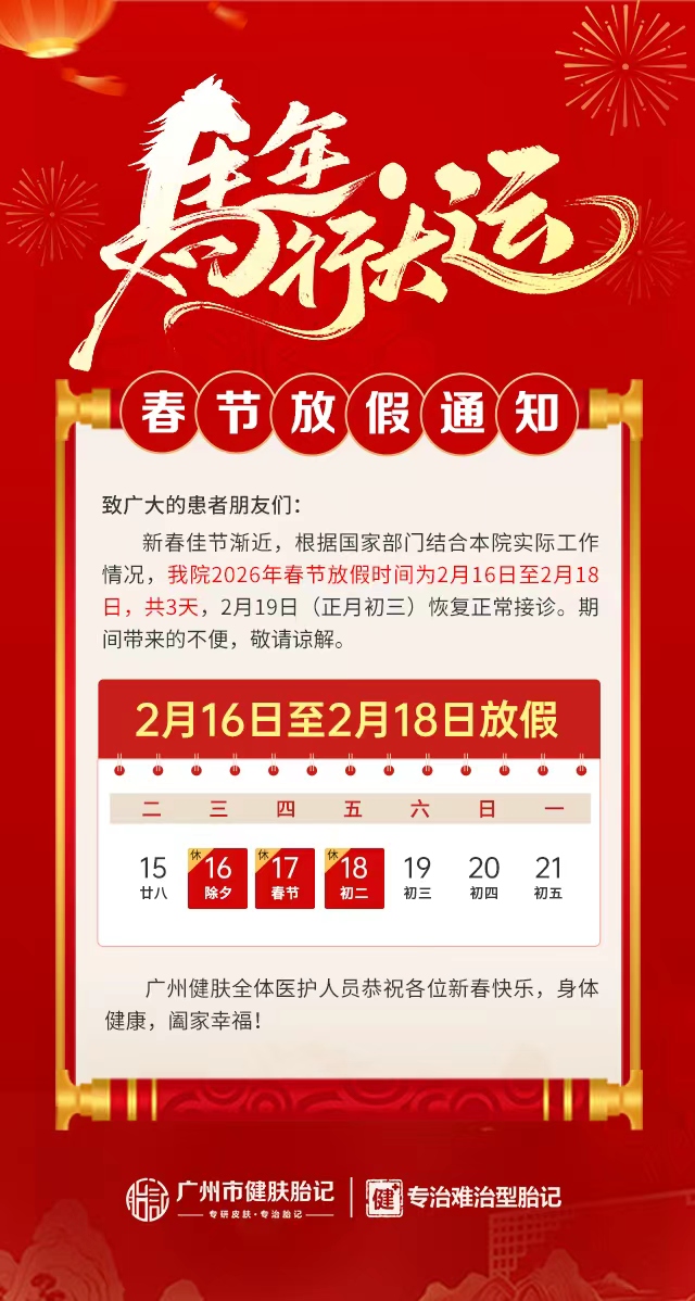 骏马踏春来,福暖伴安康。值此2026年马年春节来临之际,为切实保障广大胎记患者的就医权益,合理统筹机构诊疗工作,广州胎记机构——广州健肤胎记特发布春节放假安排通知,明确假期时间及接诊相关事宜,方便各位患者及家属提前规划就诊行程,避免跑空。